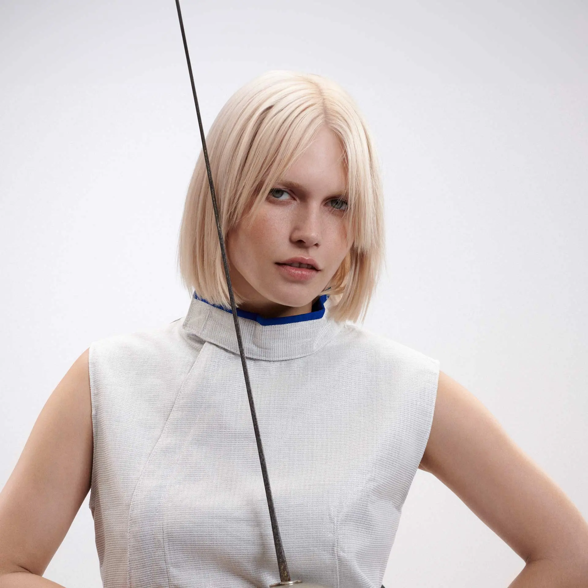 Perfekte Geometrie in perfekter Länge. Der lange, abgerundete Pony und das sanft gestufte Deckhaar geben dem Bob Dynamik und viel Bewegung, die Volumising Spray mit flexiblem Halt unterstützt. Präzises Färben mit einem monochrom sandfarbenen Toner akzentuiert die Linien und Konturen des Cuts und verleiht dem blondierten Haar Glanz.
