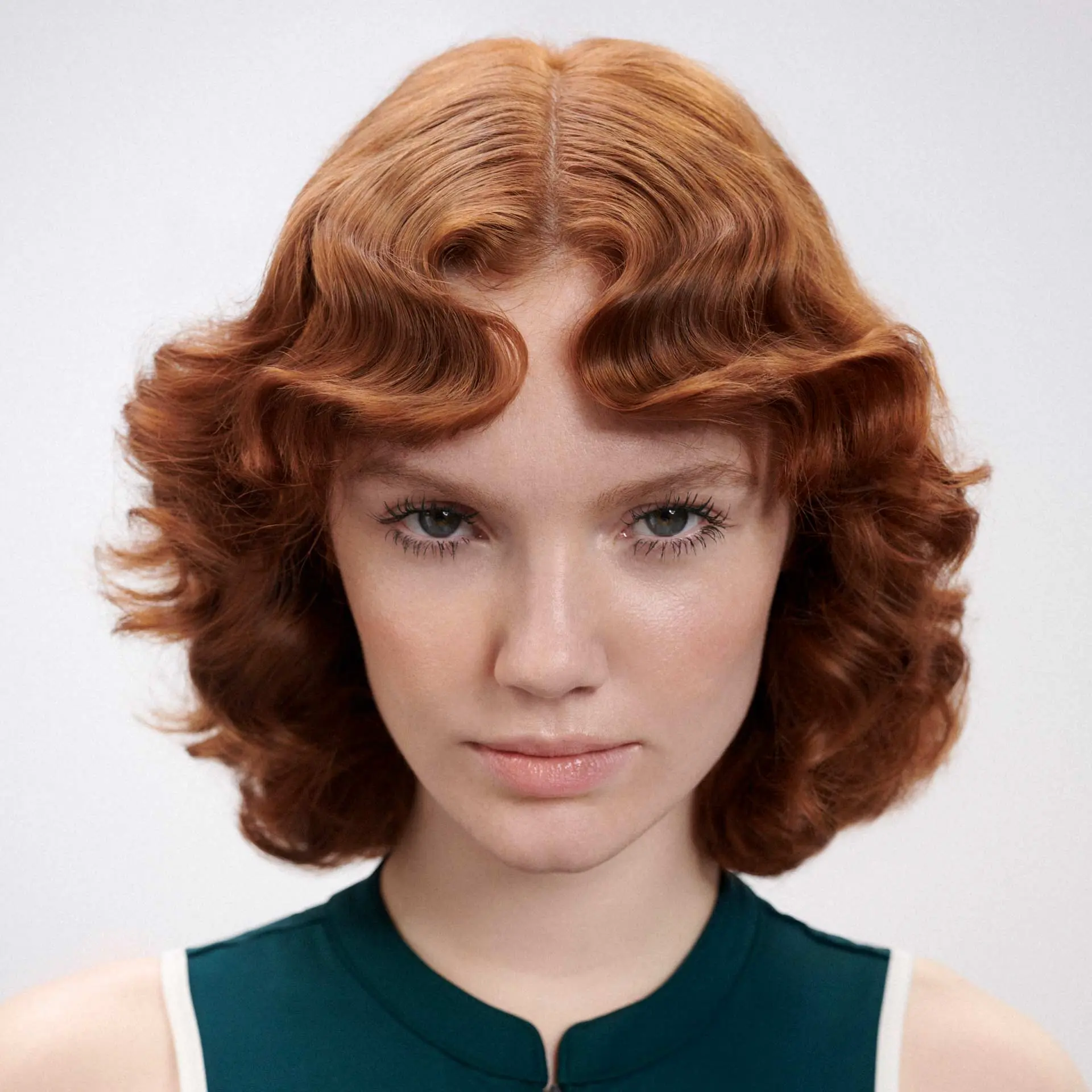 Natürliche, weich texturierte Wellen geben dem schulterlangen Look seine tragbare Lässigkeit, die in der Day-Variante mit den im Stil der 1940er Jahre und mithilfe von Curl Defining Styling Fluid definierten Wellen im Ponybereich kontrastiert. Sanft ineinanderfließende Kupfer- und Rottöne bringen die Textur der Haare lebendig zur Geltung und ergeben eine natürlich wirkende Statement-Farbe mit gesundem Glanz. Einen komplementären Fokus setzt der mit Perfect Style Evergreen üppig getönte Wimpernkranz.